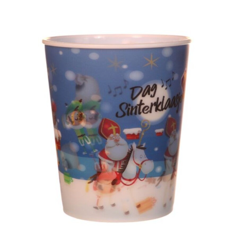Plastic 3D beker van sinterklaas met veel pieten, cadeautjes, sinterklaas en natuurlijk het paard! Draai de beker en de print beweegt!